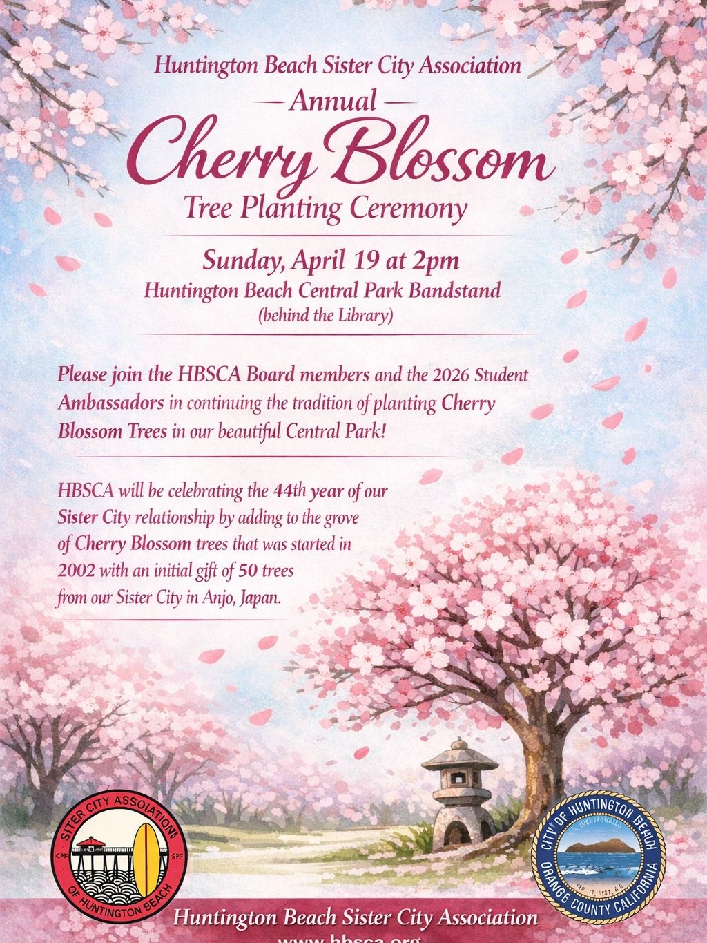 For over 43 years, the Huntington Beach Sister Ctiy Association has fostered cultural exchange and friendship between Huntington Beach and our Sister City in Anjo, Japan supported 100% by donations & volunteers. We are seeking generous sponsors to help us reach our fundraising goals!